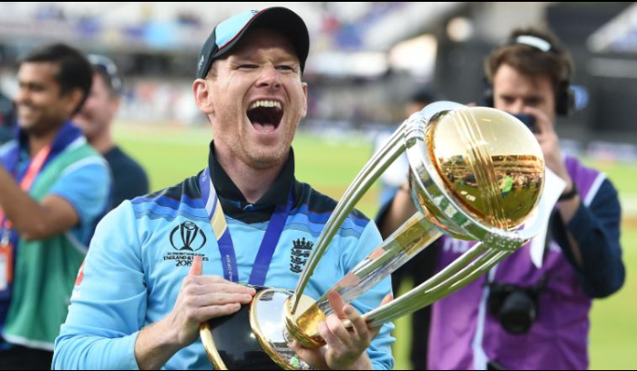 England captain Eoin Morgan with the world cup trophy.